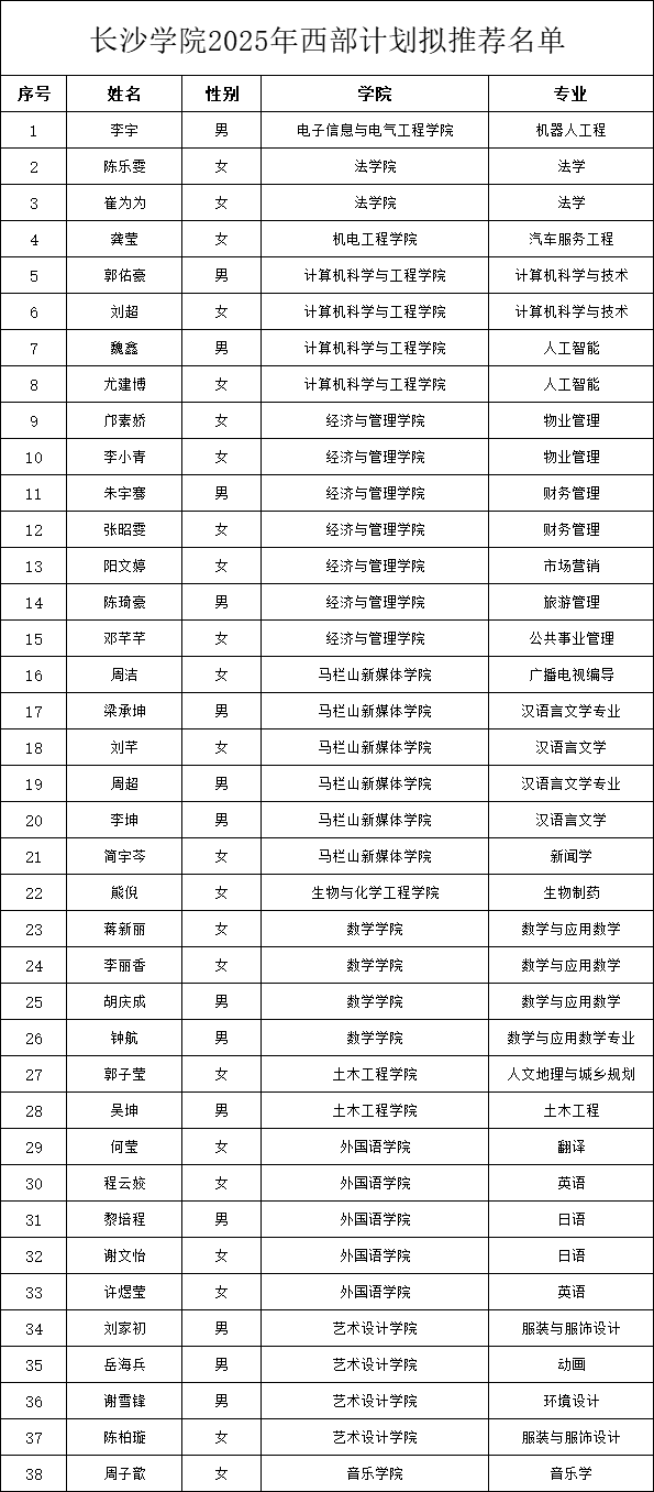 根据团中央《关于印发《2025-2026年度大学生志愿服务西部计划实施方案》的通知》和《2025—2026年度湖南省大学生志愿服务西部计划全国项目、“芙蓉花开”地方项目实施方案》有关工作安排,我校进行了西部计划志愿者的招募与选拔工作,经学生自主报名、学院初审推荐与学校笔试、面试、心理测试、体检等环节综合考察,秉持公平、公正、公开的选拔原则,拟推荐李宇等38名同学参加西部计划,现将名单公示如下:
