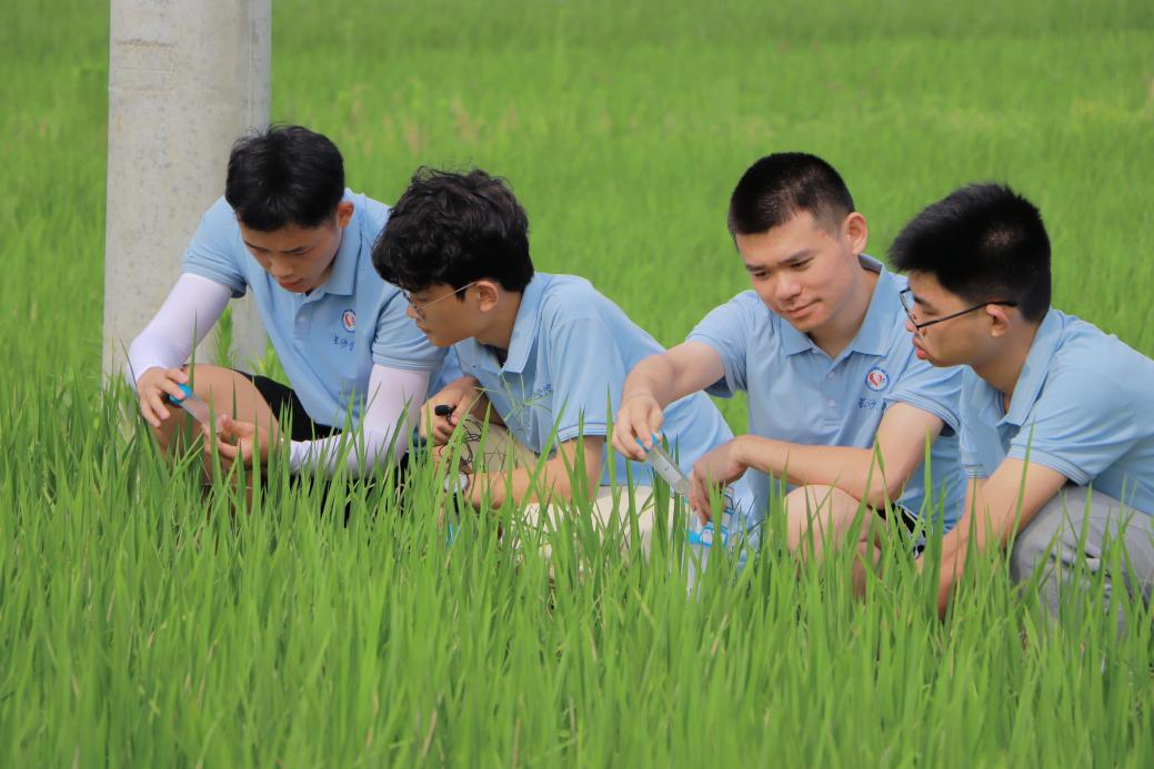 (“生物技术赋能稻花鱼生长环境保护”暑期实践团在稻田进行取样)