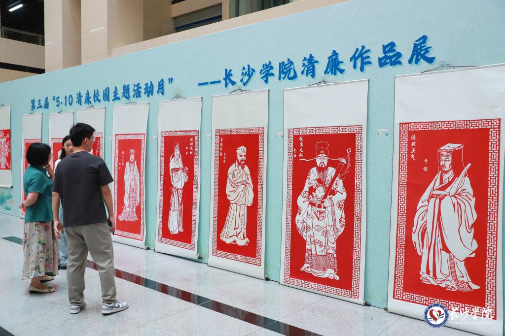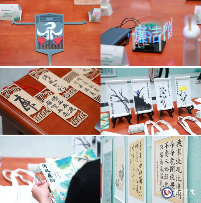 我校清廉作品展征集工作自今年4月启动以来,得到各学院、学生组织和学生社团的积极响应。征集作品涵盖书法、剪纸、文创设计、手工陶瓷、景泰蓝、3D打印或激光切割、电子科创等七大类,共计300余件。此次清廉作品展共展出作品90余件,现场分为平面展区和实物展区,其中,平面展区展出的是艺术设计学院选送的《十大清官》等十余幅剪纸作品和《爱莲说》等清廉书法校赛获奖作品;实物展区分为六个展位,展示了材料与环境工程学院的《清正“莲”洁》等手工陶瓷作品、机电工程学院《清韵廉台》等3D打印或激光切割作品、艺术设计学院的景泰蓝手工作品、电子信息与电气工程学院的电子科创作品、土木工程学院的书法作品和清廉主题文创设计校赛的部分获奖作品等。