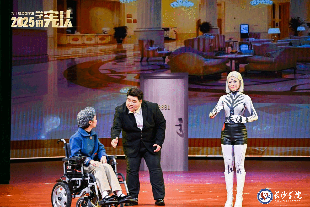 作品《敲打》紧扣社会关切的法律热点,以“轻喜剧外壳包裹严肃法治内核”的独特风格、通过真切鲜活的人物塑造将“尊法、学法、守法、用法”的法治理念娓娓道来,此前在省赛中拔得头筹,并代表湖南省出征全国总决赛。作品由教务处牵头,学校马栏山新媒体学院(影视艺术与文化传播学院)师生主导创排,法学院教师参与指导,历时六个月精心打磨。“我们既要保证剧情既符合法律严谨性,又要让‘普法点’自然融入剧情,避免生硬说教。”马栏山新媒体学院(影视艺术与文化传播学院)副院长荣斌表示。