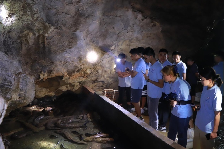 在溶洞里,团队成员重倾听,勤思考;出溶洞后,团队成员积极谈感想,实探讨。团队成员凌婷感叹,“书本上的娃娃鱼照片见过不少,但我还是第一次这么近距离观察娃娃鱼,就站在它们生活的环境里,感受娃娃鱼的成长周期,这是一次有意义的体验,尤其是养殖基地的仿生态养殖模式,让我明白生态养殖的重要性,在日后的学习实践中,我也会不断运用今天这一课。”