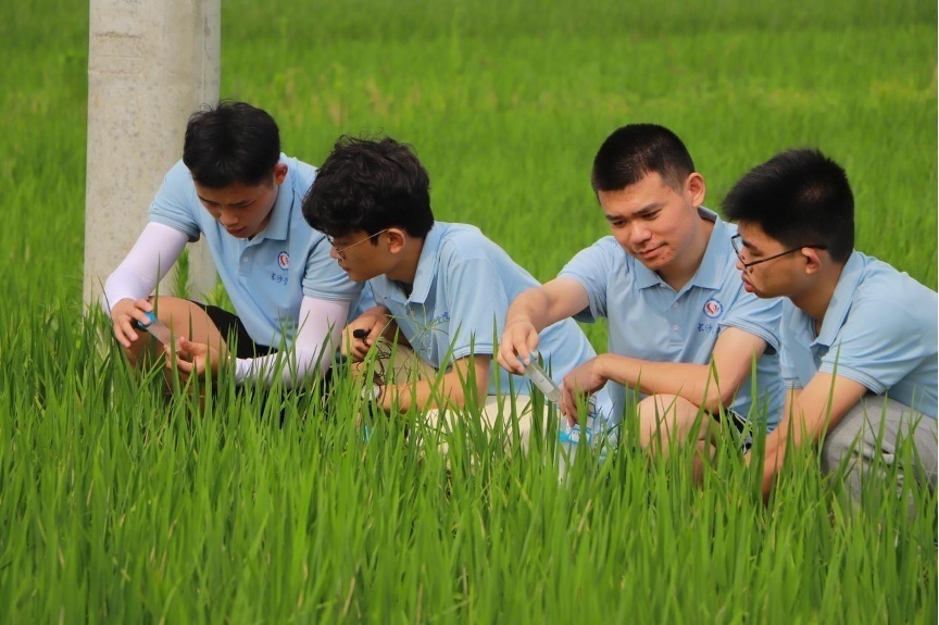 (团队在稻田间取样并观察样本)