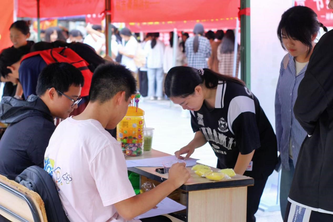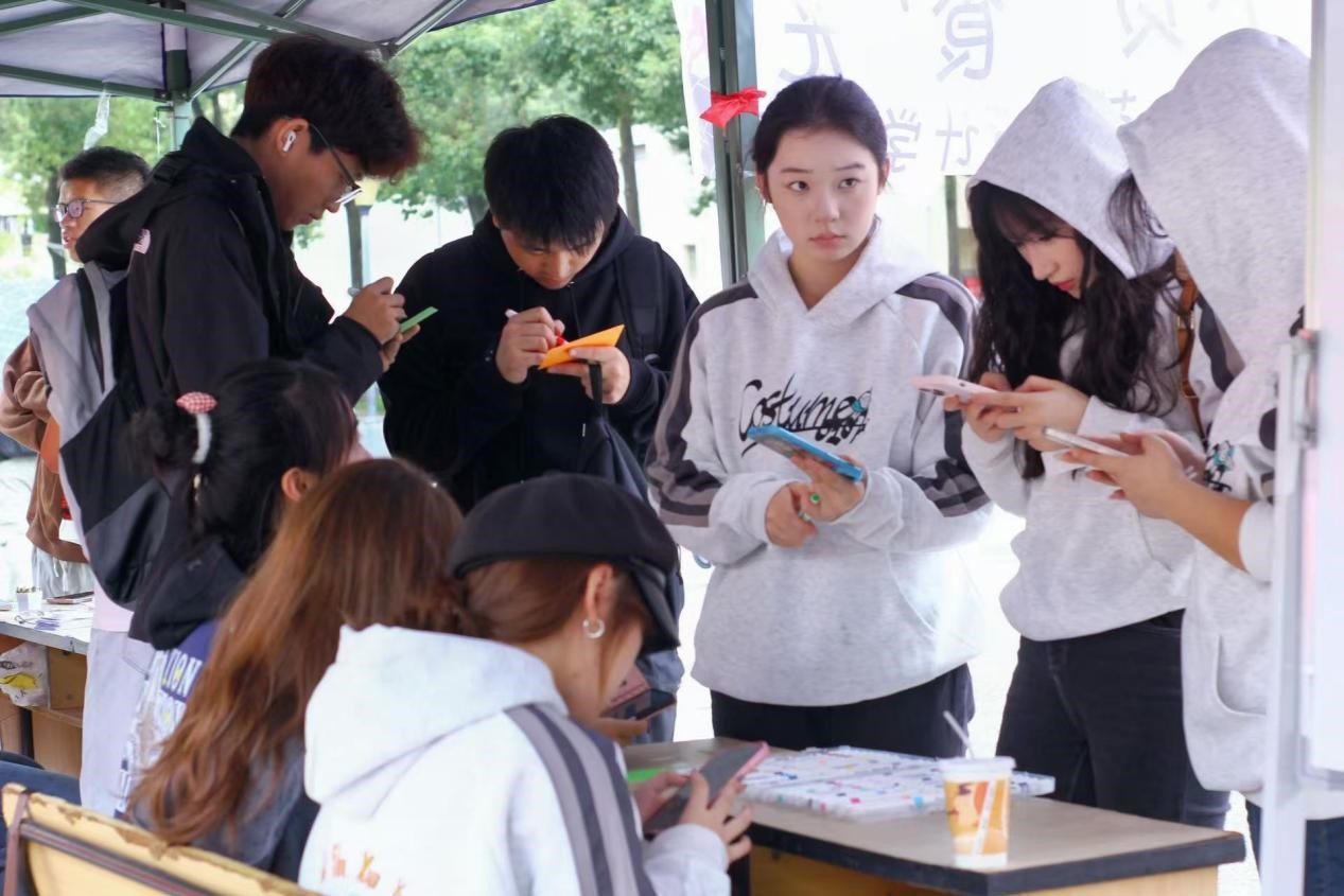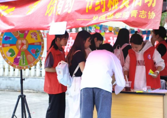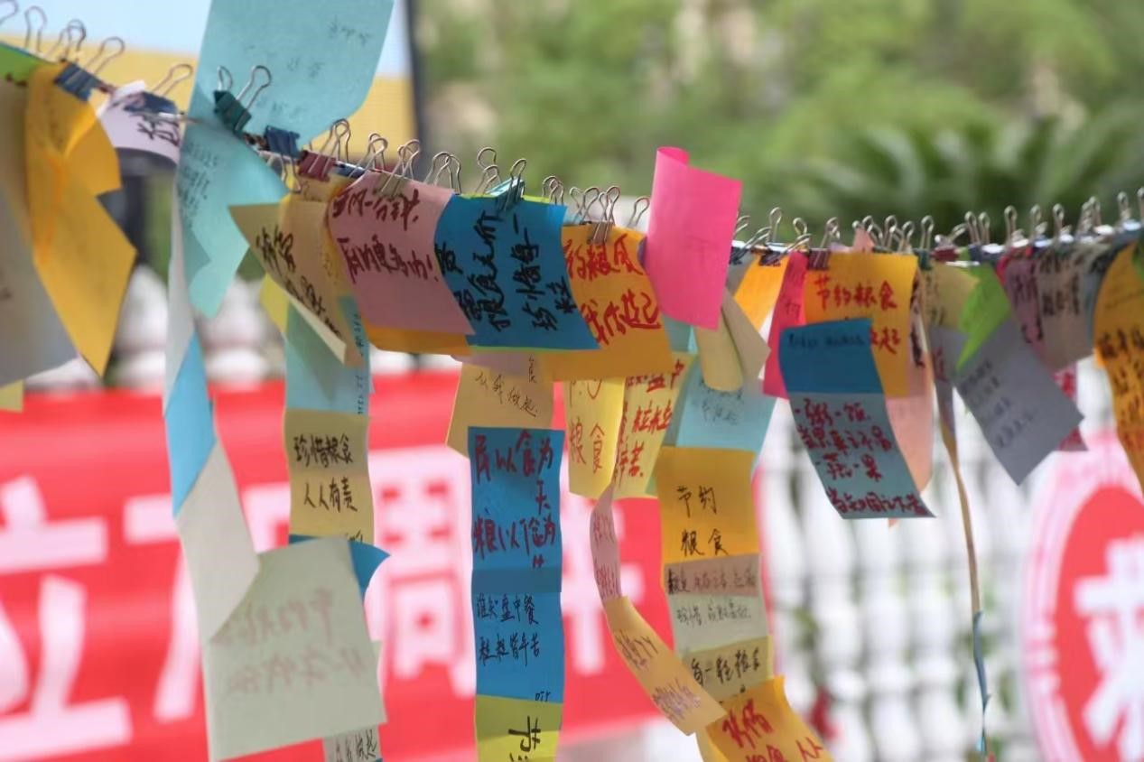 2、折纸递情。完成学院青年志愿者协会处做活动之后到总会特色立牌处拍照合影留念,再在纸卡上写下关于节约粮食的名人名言,将写好的纸卡折成千纸鹤的模样,由总会收集,挂至我们的摆点摊位上。可获得0.1分素拓。