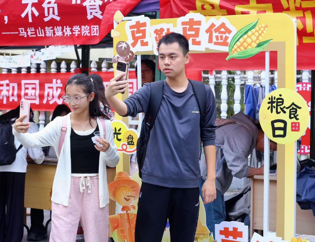 图6:同学们在特色立牌处拍照合影留念,弘扬节约粮食的美德