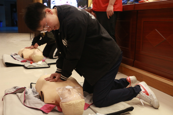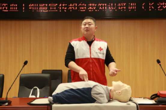 首先长沙市红十字协会应急救护培训中心主任汪建勇向同学们简单的介绍了长沙市中华骨髓库及造血干细胞捐献现状,播放了造血干细胞捐献宣传视频,鼓励同学们积极加入中华骨髓库。随后,汪建勇用一段急救口诀歌开始了急救知识培训,并讲解了可能引起心跳骤停的一些情况介绍。紧接着,汪建勇分别针对小孩和成人被食物噎住的情况做了解决方式示范,他特别强调了在为受噎对象处理时,需要向下倾斜四十五度,轻拍对方的背部,确保食物能被咳出。在其他的急救演示环节,同学们也展现出了极大的兴趣与热情。
