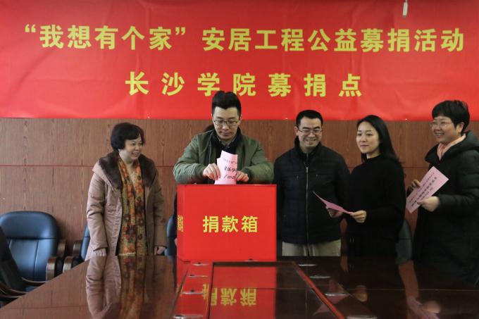 截至2015年底,我省还有无房产和D级危房户贫困家庭约23万户左右。针对我省贫困人口多,危房改造任务重的实际情况,我校积极响应省扶贫办、湖南日报牵头发起的“我想有个家”安居工程号召,在全校发起自愿募捐活动。各党总支(直属支部)、附中党委积极发动,师生踊跃参与。短短三天,共收到捐款66337.4万元,其中,长大附中党委捐赠18907.4元,我校机关党总支捐赠13050元,艺术设计学院学生捐赠了1954元。我校青志协在校内设点,同学们也奉献了自己的一份爱心。