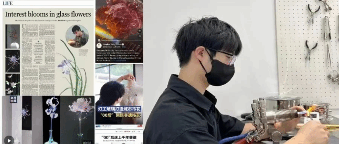 而每一次探索与学习,都是一个新的机会。何洋与非遗灯工玻璃的奇妙缘分,始于在手机里刷到的一个网络短视频。想给毕设作品增加一些特别元素的他,被视频中灯工玻璃精美的造型和质感所吸引,趁着暑假,他说走就走,跑去景德镇跟制作灯工玻璃的老师学习手艺。