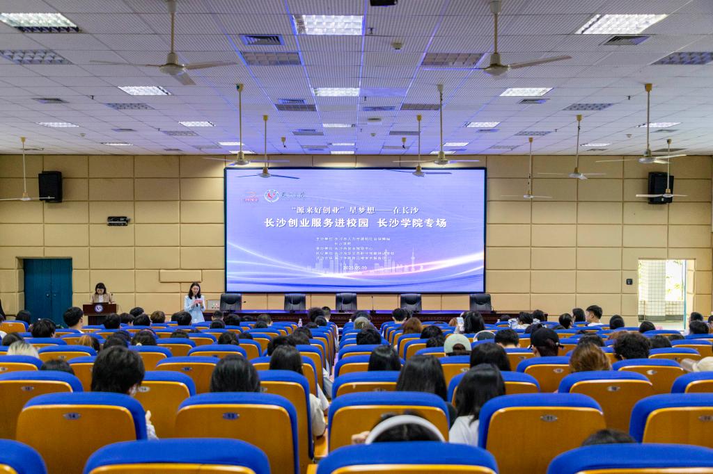 5月9日下午,长沙市人力资源和社会保障局与我校联合举办“长沙创业服务进校园”活动,活动在长沙学院致远楼学术报告厅举行,200余名学生参加此次活动。