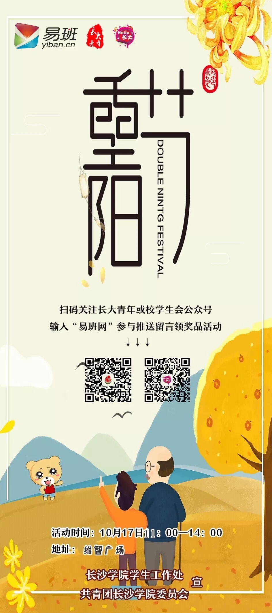 2018年10月17日,由共青团长沙学院委员会主办,易班网、长沙学院校学生会学习部、长大青年传媒中心承办的易班网宣传活动在维智大道举办。活动的主题是使全校学生对易班网的使用更为了解,帮助学生了解学校、联系学校,帮助同学更好更快融入大学生活,提高交际能力,增强综合素质,也使学校更为方便管理学生的学习与生活,同时应国家政策要求,对重阳节此等传统节日做到传承与弘扬。
