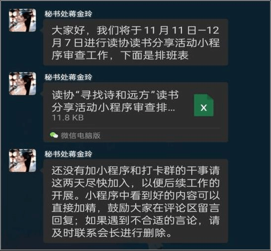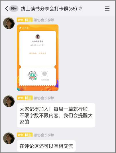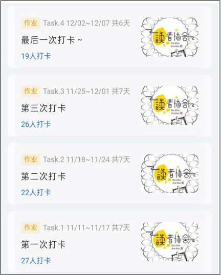 流程二:会长在线上读书分享会打卡群内按照时间段发布四周的线上读书分享打卡任务。