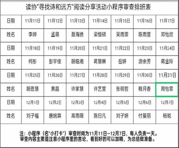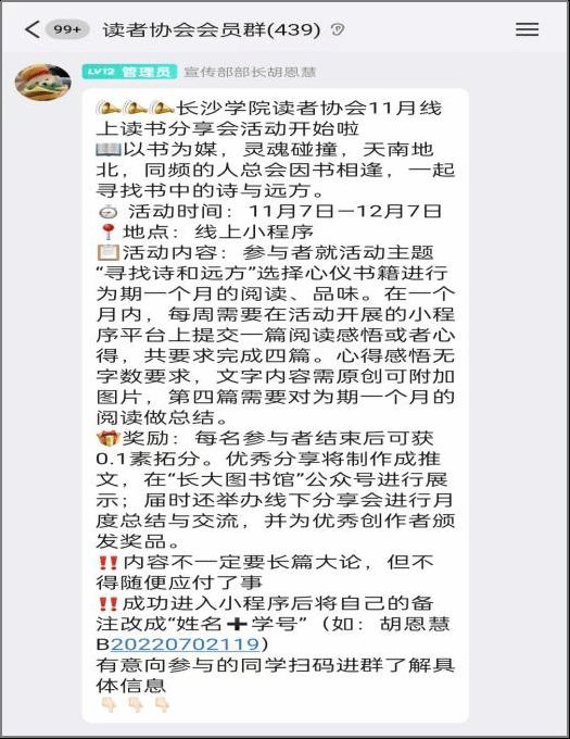 长沙学院读者协会于11月7日—12月7 日成功举办了线上读书分享会活动,参与者就活动主题“寻找诗和远方”选择心仪书籍进行为期一个月的阅读,每周在小程序平台上提交一篇阅读感悟进行汇报。