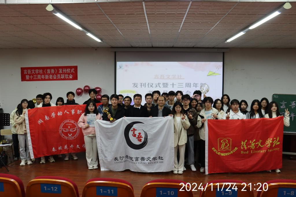 为庆祝言吾文学社发展至今所带来的诸多成就,本社特此举办发刊仪式暨十三周年新老会员联欢会,活动于2024年11月23日在宁静楼T2教室举行,特别邀请湖南省湘文社委书记刘震、副理事长廖国栋、青年作家聂亚萍、其他高校文学社代表等一同参与,共襄盛举。