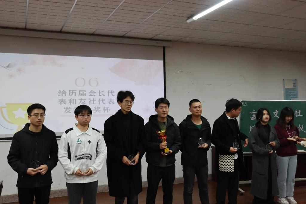 第三项,颁发荣誉社长奖杯,历届社长发言,前任社长汪熊宇就言吾的发展历史,如何一步步从四星级社团走向五星级社团,进行慷慨激昂的言论,让观众身临其境的感受到这个过程的艰辛与不易;第三届社长社长王冠军就目前言吾的发展情况发表了看法,社团如今能够如此的壮大,生气蓬勃,离不开各位社长与干部的付出,也离不开每一位社员的帮助。激励社团以更加昂扬的姿态面向未来。