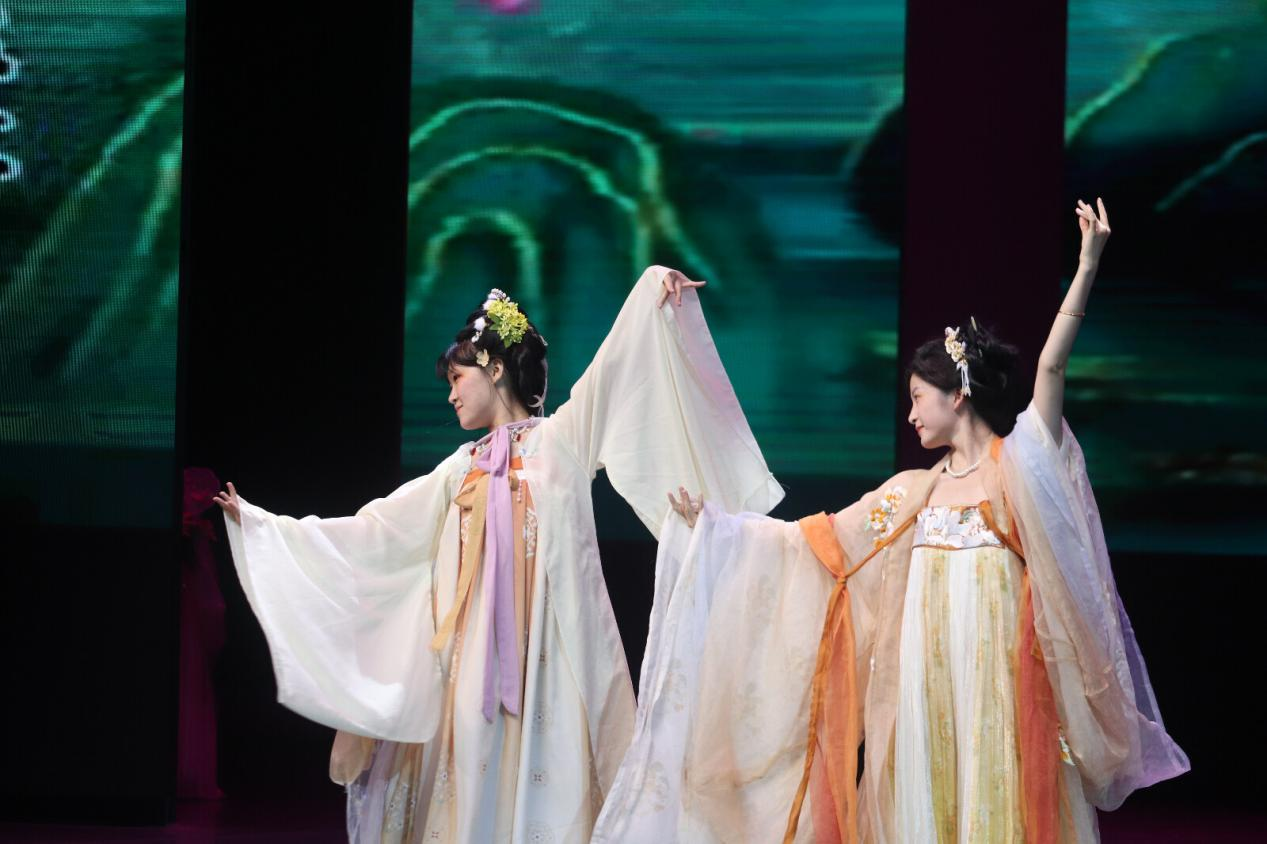 明源国学社以一曲悠扬的古筝独奏开场,瞬间将观众带入了古典雅致的氛围之中。紧接着,《十二花月令》的表演缓缓展开,身着华丽汉服的表演者们依次登场,生动诠释了每个月份的花语与意境。从一月水仙凌波的清冷,到二月杏花微雨的柔情,直至腊月蜡梅傲雪的坚韧,每一幕都如诗如画,让观众仿佛置身于古代文人的花月世界。