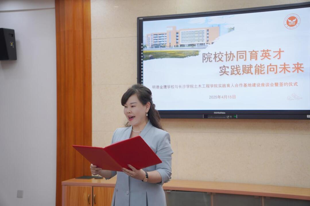 新湖南客户端4月16日讯(通讯员 常熙缘)4月15日下午,明德金鹰学校与长沙学院土木工程学院实践育人合作基地建设座谈会暨签约仪式在明德金鹰学校举行。双方领导、师生代表齐聚一堂,共同见证这一重要时刻。活动由明德金鹰学校教学副校长唐灿主持。