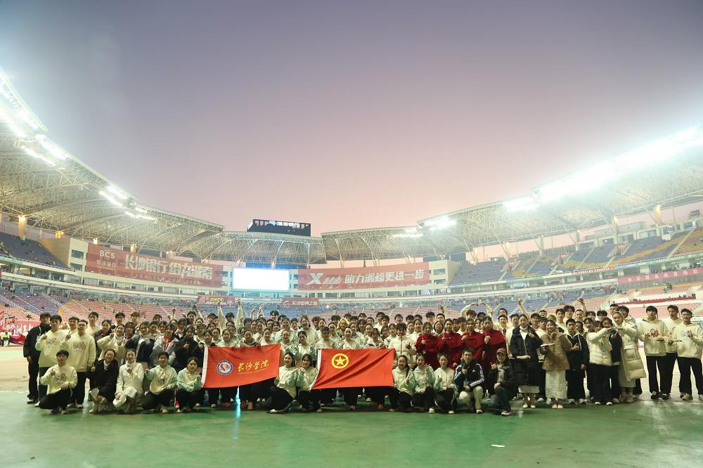 (长沙学院青年志愿者在湘超四分之一决赛现场合影,张栖溶 摄)