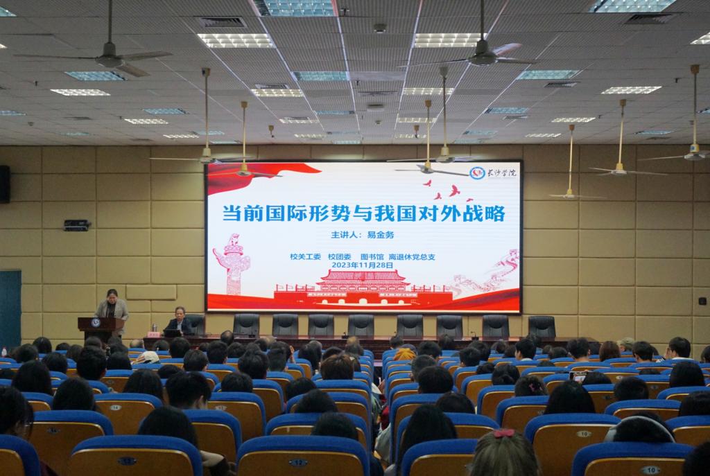 11月28日,由校团委联合关工委、图书馆、离退休办组织的“长沙学院2023年大学生青年马克思主义者培养班”国际形势课在学校学术报告厅开讲,这也是本学年培养班的最后一堂理论课,特邀国防科技大学首届教学名师、全军优秀教师、全国优秀教育工作者易金务教授主讲,培养班学员近300人在场聆听,并吸引了学校部分离退休老同志代表同堂学习。易金务教授以《当前国际形势与我国对外战略》为题,用渊博的知识、翔实的资料、丰富的事例...