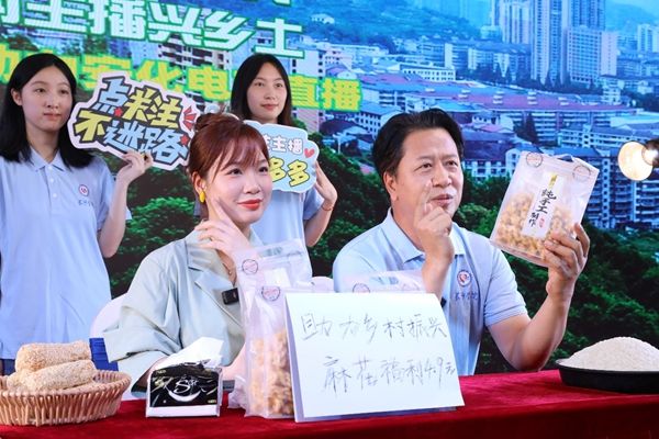 长沙学院与安化县梅城镇人民政府、安化一中分别签订了校地战略合作协议、共建实习基地协议,并由马栏山新媒体学院副院长荣斌率主播美丽、导演马犇、总监王雅兰、总监曾杞林等特聘实践导师以及长沙学院“厚朴”暑期实践团大学生主播们,以现场直播带货安化梅城土特产的方式,进行上了培训示范。现场不时传出一声声热情洋溢的吆喝声,飘出一阵阵腊肉香、麻花香。
